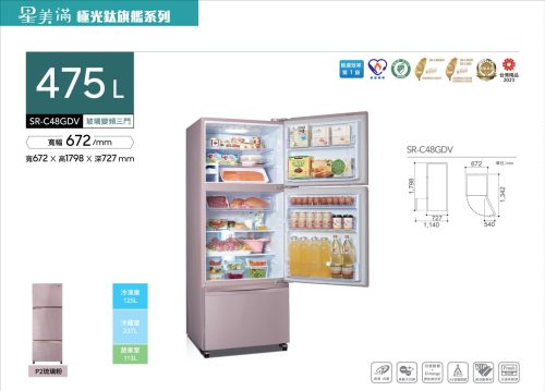SR-C48GDV(P2) 顏色:琉璃粉 產地:台灣 尺寸:672(W)*1798(H)*727(D) 重量:92 實際公升數:475L 能源效率:第1級 全機保固:1年 壓縮機保固:3 年
