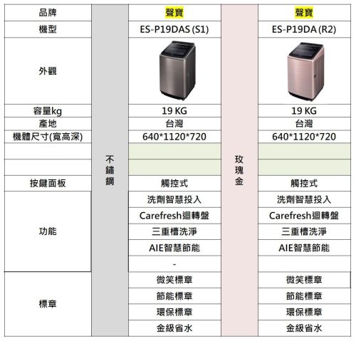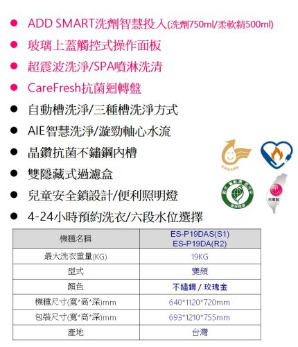 19KG 型式:變頻 顏色:S1不鏽鋼 / R2玫瑰金 機體尺寸(寬*高*深 mm):640*1120*720mm 外包裝尺寸(寬*高*深 mm) :693*1210*755mm 產地:台灣
